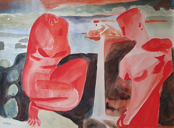 Red Classical Greek Art Sculptures in front of road leading to an Island. Creation of the Contemporary Art Master Painter Enrico Garff. Classical and Modern Art merge in the ModClassic Art Style. The Gripenberg Art Collection Museum in Helsinki owns this Masterpiece artwork painting.