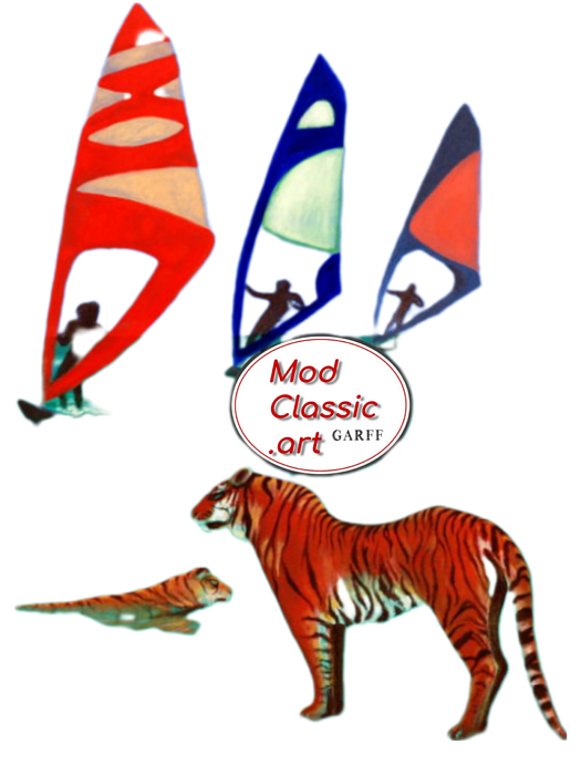 Two tigers swimming in the sea with three windsurfers sailing in the background. The ModClassic Art by Garf Logo shows up in the middle. Rd, Orange, blue and aquamarine blue are the main colours in this summer theme by Enrico Garff.